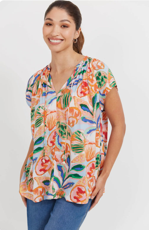 An easy-wear staple with a soft subtle shimmer, the Baja Top is designed for relaxed summer days. Featuring a V-neckline with shell charm-tipped ties, gentle gathering, flutter sleeves, and a swing hem, it offers a flattering, floaty silhouette.