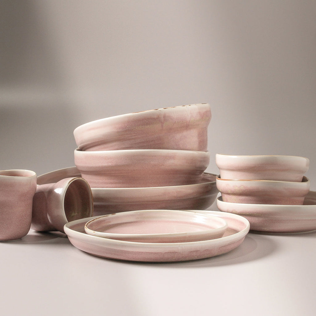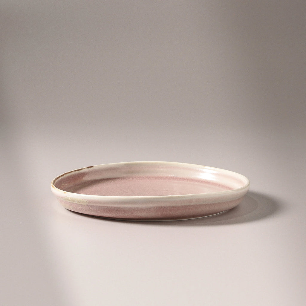 The Suiki Side Plate emerges in a soft dusty pink, its surface washed in a reactive glaze that gathers into gentle, golden-rust speckles. The effect is quietly poetic — an organic palette that feels both contemporary and timeless. Crafted from porcelain with a subtly textured finish, each plate carries the impression of the hand, echoing a primitive elegance that remains refined.